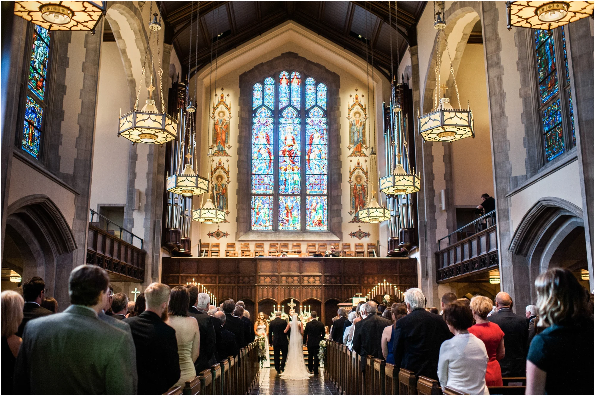 We had already done our own personal site visit to Independent Presbyterian after meeting with Kayla one day. We were so excited about their wedding, we just had to go check out this sanctuary! We fell in love immediately. The colors of the stained glass literally create prisms of light over the entire room. Kayla had a very specific vision for her first look in the courtyard. She wanted Jonathan to read a letter from her first, which actually brought him to tears. We were all a little surprised by this sweet show of emotion, but soon both Kayla and Jonathan were in tears as she joined him in the courtyard. The rest of the day continued in the same pattern of joyful moments as we watched them become husband and wife, and then dance the night away at Inverness Country Club. Everything was perfect with the help of Liz and Invision Events, and we're so happy that we got to join this vendor team and wonderful couple in such an amazing day!